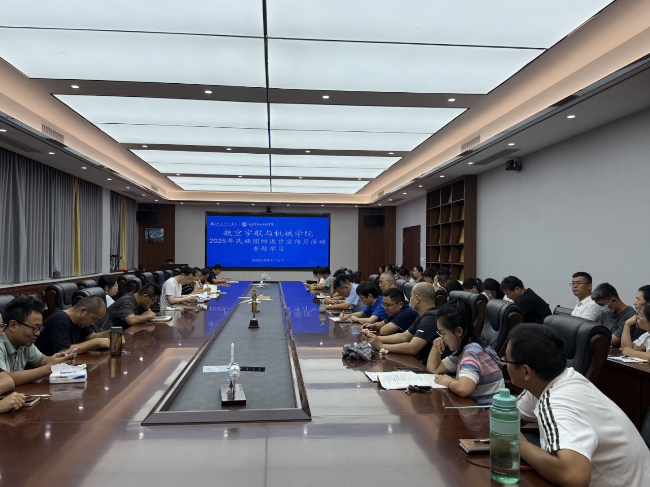 为深入推进铸牢中华民族共同体意识宣传教育,根据《必赢272net入口2025年民族团结进步宣传月活动实施方案》要求,9月16日,航空宇航与机械学院组织全体教职工在工程训练中心324会议室开展2025年民族团结进步宣传月活动,全体教职工参加。