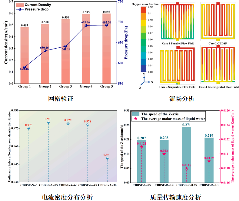 为解决传统流场设计在气体传输效率、均匀性和流动方面的局限性,提出了一种新型的流场结构。建立了三维多物理场模型,以评估关键几何参数(包括弯道数量、倾斜角度和圆角半径)的性能。结果表明,与传统的平行、蛇形和指状流场相比,该结构在提高氧气传输效率、改善电流密度分布均匀性以及在保持合理压降等方面有着良好的优势。研究表明,在弯道数量为5、倾斜角度为 75°和圆角半径为 0.25 mm的优化配置下,实现了卓越的流场输出性能和增强的流场管理。这项研究为不同燃料电池中流场结构的高效设计和工程应用提供了理论指导和技术支持。